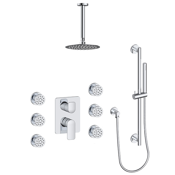 Tub/Shower package includes: valve trim, shower head, shower arm, and hand shower, slide bar, elbow and hose,body jets ,with or without sharing